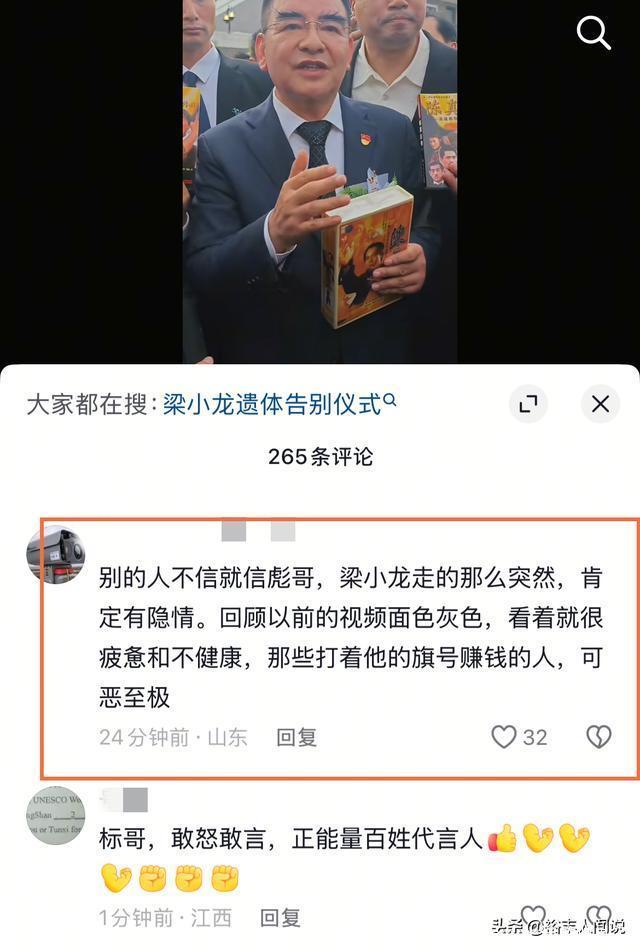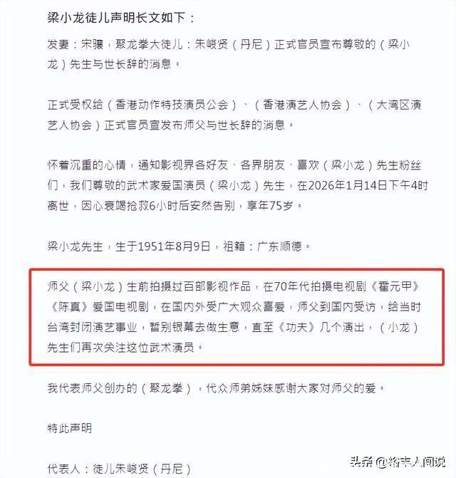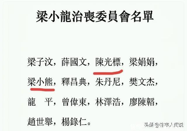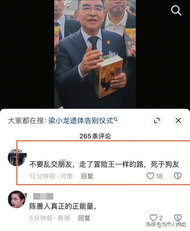 1月26号,梁小龙的追悼会在深圳龙岗殡仪馆举行,现场来了诸多圈内艺人,这其中包括林威、陈惠敏、刘永、郑恕峰、黄子扬等等,另外,徒弟以及周星驰等人都有送花圈致哀。 据媒体透露,梁小龙的灵堂一共分为两处,公开悼念的一处是为粉丝准备,另外一处则是为家人准备。 早在之前,梁小龙的徒弟就曾透露,治丧委员会的名单中有陈光标,起初很多人还不相信,直到其现身在线炒股配资网,这才打消网友的怀疑,不过他因为笑容以及言语惹来了更大的争议,难道说梁小龙去世还有另外一层原因? 由于梁小龙去世的太突然,所以很多人猜测是不是因为心梗导致,随后,遗孀发声明称,梁小龙是因为心脏衰竭,抢救6小时不治身亡,享年75岁,关于其他细节,并没有透露,但陈光标却说了一段让人感慨不已的话语。 接受采访的时候,陈光标一共说到了两点,第一便是希望徒弟们能够继承其精神,第二则是梁小龙去世的一些原因:我说一句啊,小龙师傅的走,今天不是真正的病走,因病而走,也不是因为真正的老了而走,是被一些人折腾走的,是被一些人心怀不正,那他去赚“米”的人走的。 从其话语中可以听出另外一层意思,那就是梁小龙之所以会患上心脏衰竭,并不是因为本身,而是因为被身边的人过度索取导致。 不同于演角色,梁小龙的为人很诚恳真挚,但却有一个缺点,那就是不会经营自己,说白了,就是不会做生意,但凡会,当年也不会再度出山演艺角色。 陈光标的这番表述很在理,对于年过七旬的人来说,最重要的不是赚钱,而是好生休息,但近几年的时间里,梁小龙频繁活跃在视频账号上,那些拍摄的日常看似简单,其实也是一种精力消耗。 普通人都难以承受,何况是年过古稀的老人。 这也是为什么陈光标说出那番话的原因之一。 其实,陈光标这样的说辞不是没有道理。早前,梁小龙的经纪人就曾发视频称,师傅人很好,总会借钱给徒弟交房租,前后差不多有千万。 不过陈光标的话语也有一些片面,如果梁小龙不同意,那么身边人也不会借着其名气过度“索取”,而且梁小龙还有一双儿女,目前都在留学,需要的生活费以及学费都非常的高昂。 归根结底,还是梁小龙为人太和善,太好了,不懂得拒绝,自然就会惹来无休止的索取。 什么的年纪做什么样的事,这都是既定的,一旦超过,不但精力以及思想跟不上,而且还会导致其他的危害。