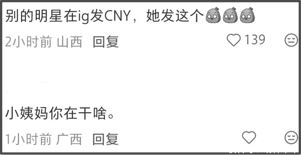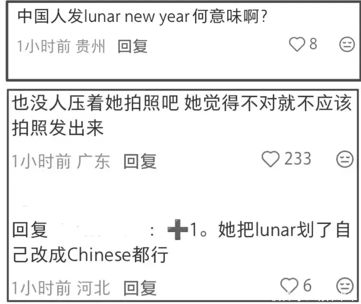 ——有网友发现,42岁女星邓家佳发布新年祝福的时候,明晃晃配上了一张带有“Lunar New Year”的照片,大年初一就发了出来,好几天过去了,哪怕有网友留言提出质疑,她还是没有第一时间删除。