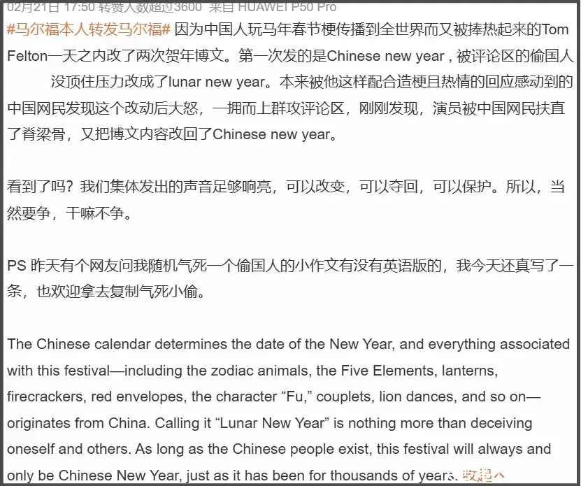 还好,在中国网友据理力争之下,汤姆·费尔顿修正了错误,改回了“Chinese New Year”。