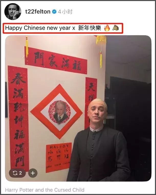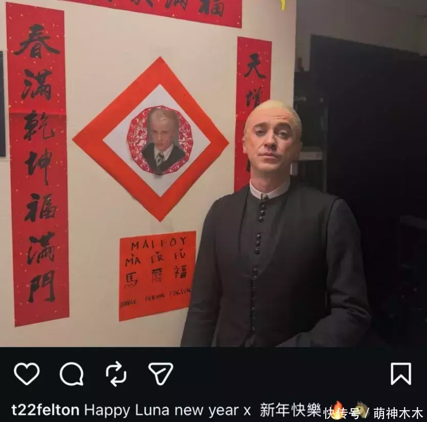 汤姆·费尔顿是电影《哈利·波特》主要角色马尔福的扮演者,因为角色谐音,一到春节,就会有中国网友和他互动,2026年是马年,汤姆·费尔顿回应了中国网友,发了“Chinese New Year”庆祝新年。