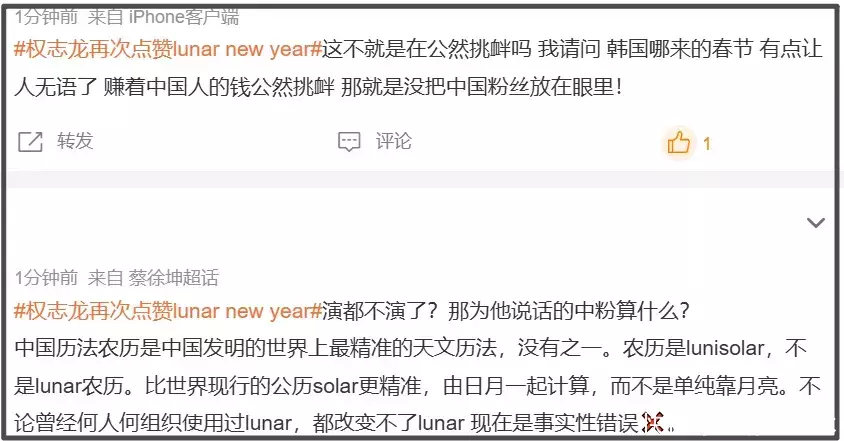 不仅如此,权志龙后续还点赞了大量使用“Lunar new year”的动态挑衅。